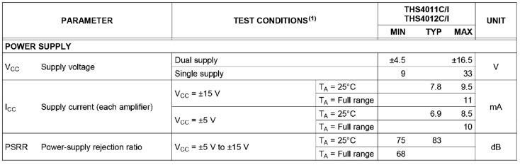 電源適配器參數(VSS、VDD和IDD、IQ)通常作為獨立項出現在產品數據手冊的參數表中。該參數偶而也會作為PSRR參數的測試條件。圖所示為[1]THS4011、THS4012數據表的電源適配器參數。