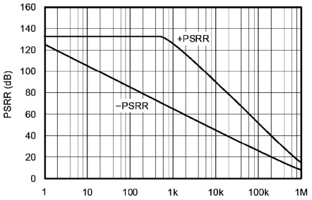 與放大器的開環增益(AOL)特性一樣,PSRR也是頻率的函數,隨著頻率的升高,PSRR的數值開始下降。如圖1.1.3所示[4],電源適配器產生的變化(或者噪聲,疊加在電源適配器上的噪聲也會引起電源適配器電壓的變化)在1kHz以下,+PSRR約為130dB;之后,隨著頻率的上升,PSRR不斷下降。而-PSRR隨著頻率的上升,不斷下降。很明顯,對高頻電源適配器變化(噪聲)的抑制能力要低于對直流和低頻電源適配器變化(噪聲)的抑制能力。